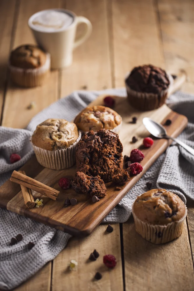 Rich chocolate muffin packed with choc chip. Delicious warm or cold.